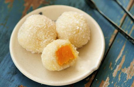 8、将成形的糯米糍放入装有椰蓉的碗内,滚一圈便成。