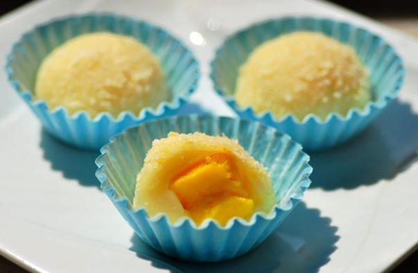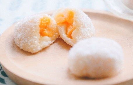 材料:1盒250ml维他芒果汁,250g糯米粉,10茶匙细砂糖,少许椰蓉,1个芒果