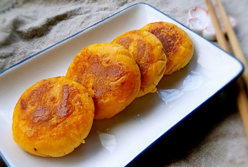 5、锅中放少量油,油热后,放入豆沙红薯饼,煎至两面金黄即可。
