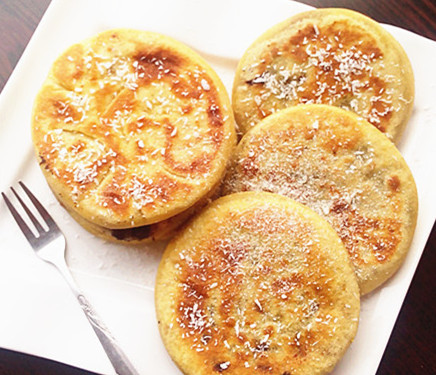 9、平底锅内加薄油,锅温热时放入饼胚,小火煎至两面金黄出锅,中间盖锅盖。煎好出锅装盘即可。