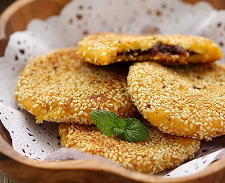 6、用手压成饼状,(沾满白芝麻后用手多揉揉炸的时候芝麻就不容易掉)。用少许油小火煎熟。