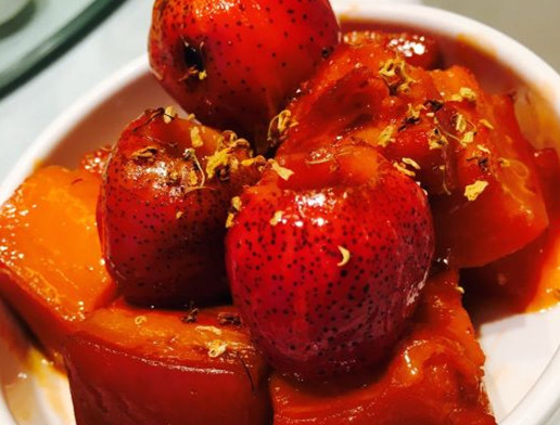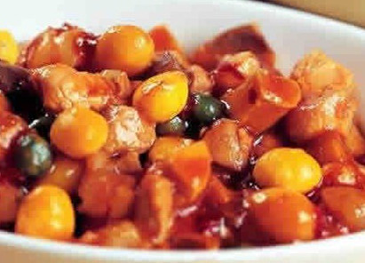 3、锅内放油烧热,姜末爆锅,倒入山楂泥翻再加少许酱油、白糖、熬成稠厚卤汁,倒入肉丁,翻业务水平均匀即可。